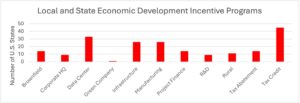 To address regional cost-of-doing-business differences, all fifty states offer some form of economic development incentives. These incentives play a supporting—but often decisive—role in corporate site location decisions. As highlighted in national data, tax credit programs are offered by nearly every state, followed by additional tools such as data center incentives and broad-based tax abatements. According to Princeton Economics, state and local governments invest approximately $45–60 billion annually in economic development incentives, even as companies pay more than $1,096 billion each year in state and local taxes.