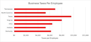 Evaluating state and local tax policy on a per-employee basis provides additional insight into a state’s overall business climate. This approach accounts for population differences and offers a clearer comparison of tax burden across states. Data shows that Texas, Virginia, Ohio, and Kentucky impose some of the highest per-employee state and local tax burdens, while Indiana and North Carolina maintain comparatively lower levels. Indiana consistently ranks as a leader in maintaining a low tax burden for local businesses.