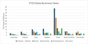 Comparing state and local tax policy across Indiana, Kentucky, North Carolina, Ohio, Texas, and Virginia illustrates how tax structures affect industries differently. In Kentucky, Indiana, and Ohio, property taxes represent the dominant tax burden for many businesses, while income taxes help spread revenue collection to individual taxpayers. States without an income tax, such as Texas, shift a greater share of the tax burden to businesses through higher sales and property taxes. Meanwhile, states like Tennessee and North Carolina, which have economies and population sizes comparable to Ohio, have adopted state and local tax policy frameworks that place a lower overall burden on businesses by relying more heavily on sales taxes that are generally more favorable to manufacturing and office projects.